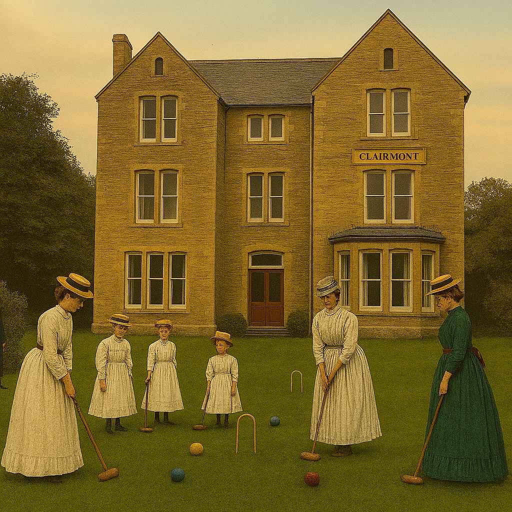 This image is not real. But it is rooted. Digitally refreshed to imagine what once was: young women in corseted dresses, mallets in hand, playing croquet under the watchful symmetry of Clairmont’s stone facade.